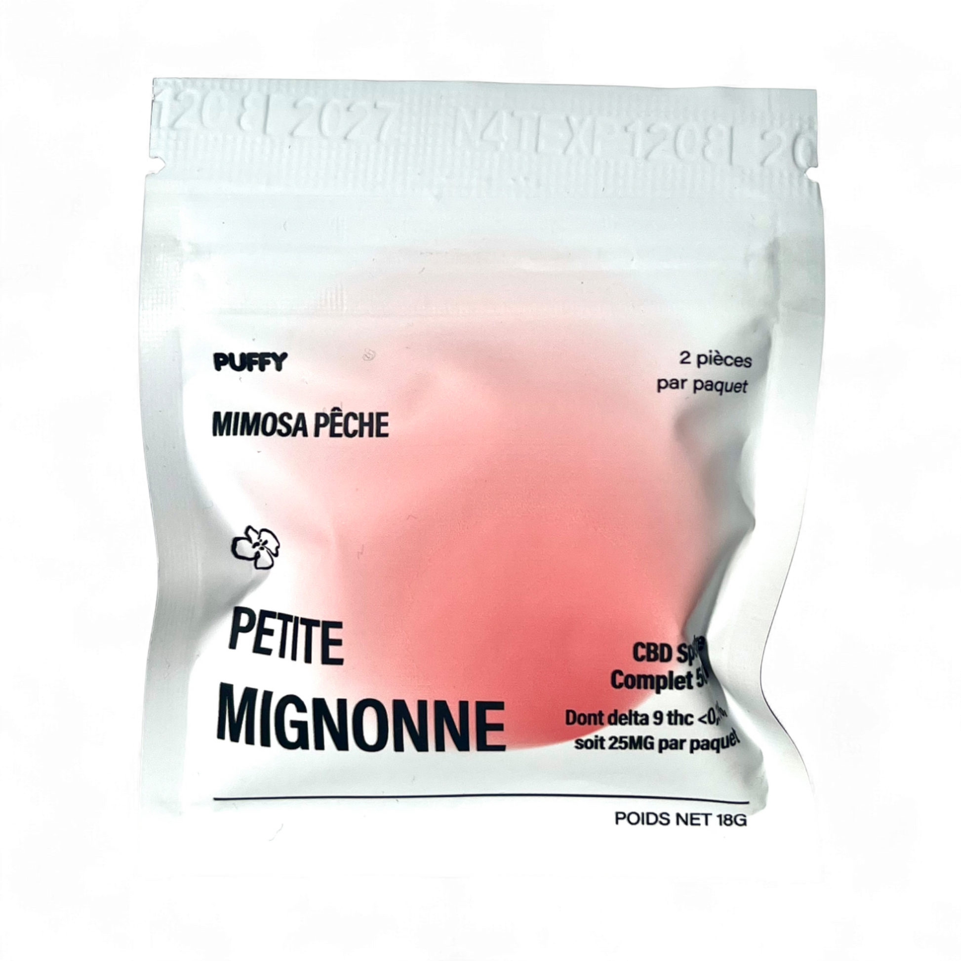 Les gummies à la pêche Puffy sont composés de 12,5mg de THC et de 12,5mg de CBD par bonbon .